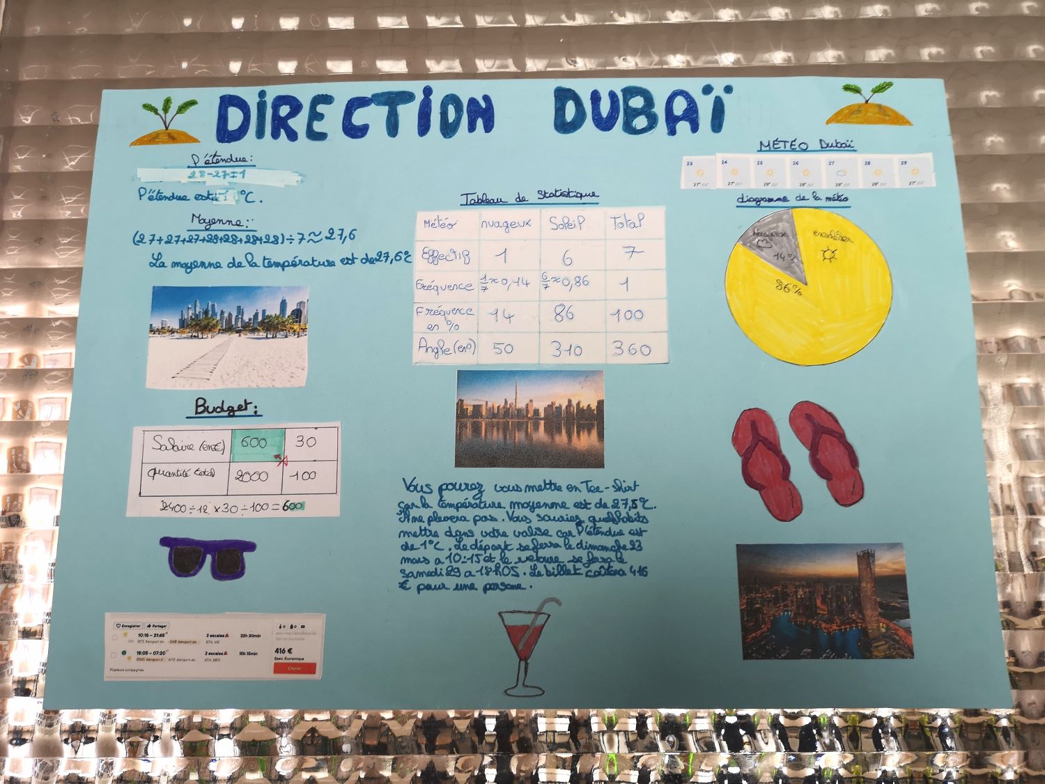 Avec les vacances qui arrivent, les élèves de 4ème ont dû préparer un voyage à Mme Raud et Mme Chiron en cours de mathématiques. Bien entendu, leurs professeures leur avaient donnés des contraintes à respecter : des billets d’avion à moins de 30% de leur salaire mensuel, un maximum de 3 jours de pluie, une moyenne des températures entre 15°c et 30°c…