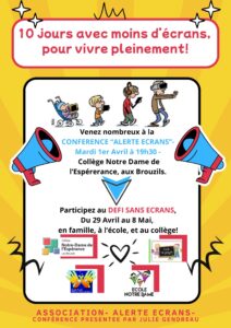Mardi 1er Avril 2025, Mme Julie GENDREAU de l’association Alerte Ecrans est intervenue, dans le cadre d’une conférence sur le thème des écrans.